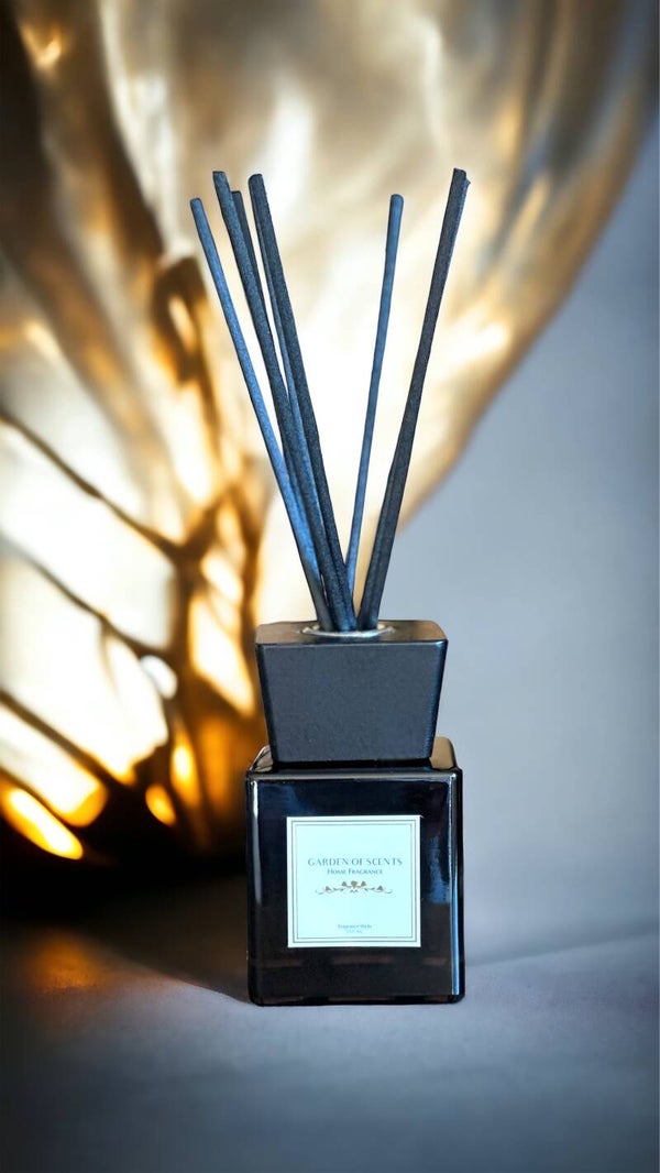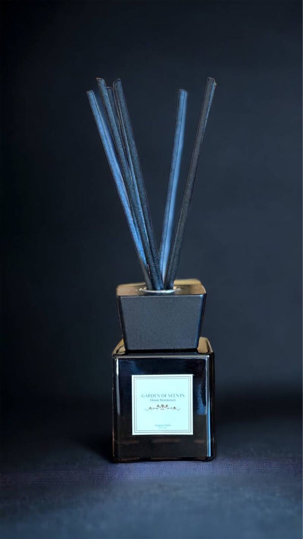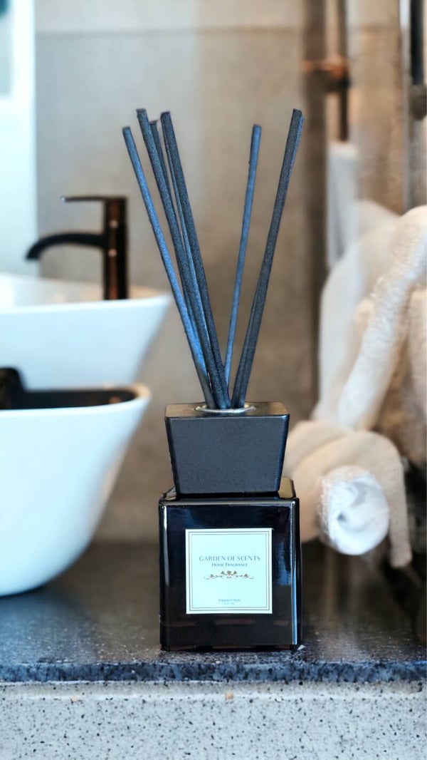 Inhoud: Transparant zwarte 200ml vierkante fles. Zwarte robuuste zwarte vierkante dop. 10 vezel sticks in zwart 25cm lang.